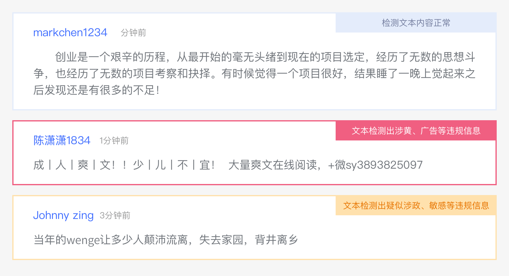 对海量的用户原创文本内容进行审核,快速定位违法低质的文本信息,确保产品内容质量可控,帮助 UGC 平台节省审核人力